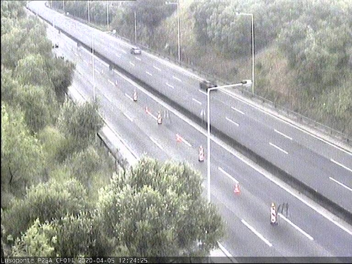 As autoridades continuam este domingo a fiscalizar as saídas no sentido norte-sul, de Lisboa para Almada, no acesso à Ponte 25 de Abril, conforme imagem da Lusoponte, que mostra as barreiras ja colocadas.